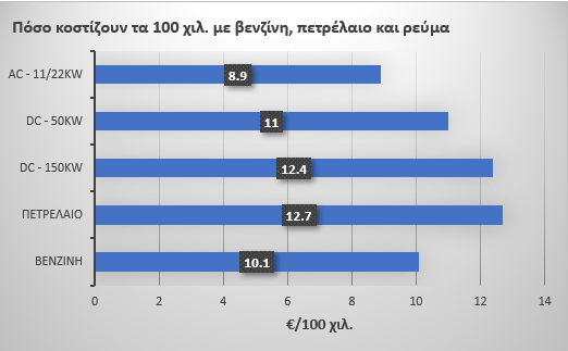 Η διαφορά του κόστους ρεύματος οφείλεται στο χαμηλότερο χρόνο επαναφόρτισης σε DC σταθμούς. Στην ίδια έρευνα πραγματοποιήθηκε και μία συγκριτική ανάλυση του κόστους και χρόνου επαναφόρτισης για τις διάφορες κατηγορίες αυτοκινήτων και επίπεδα φόρτισης. Η μετάβαση από φορτιστή AC σε 50 kW DC, προσθέτει επιπλέον κόστος 4,3 € και φτάνει τα 12€ για εξοικονόμηση από 103 έως 283 λεπτά, ενώ το επιπλέον κόστος για τη μετάβαση από 50 kW DC σε 150 kW DC είναι από 2,9€ έως 8€ για εξοικονόμηση 6 έως 55 λεπτών, αντίστοιχα. Το κόστος φόρτισης σε DC σταθμό 150 kW για ένα αυτοκίνητο κατηγορίας C είναι 56,7 € και ο χρόνος φόρτισης είναι 33 λεπτά.